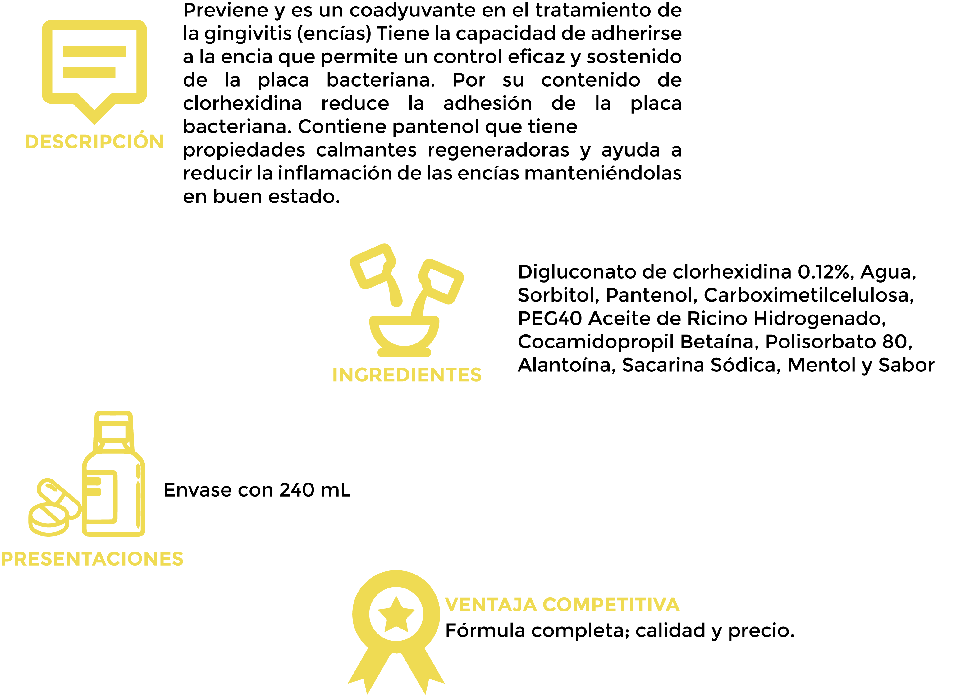 Previene y es un coadyuvante en el tratamiento de la gingivitis (encías) Tiene la capacidad de adherirse a la encía que permite un control eficaz y sostenido de la placa bacteriana. Por su contenido de clorhexidina reduce la adhesión de la placa bacteriana. Contiene pantenol que tiene propiedades calmantes y regeneradoras y ayuda a reducir la inflamación de las encías manteniéndolas en buen estado.