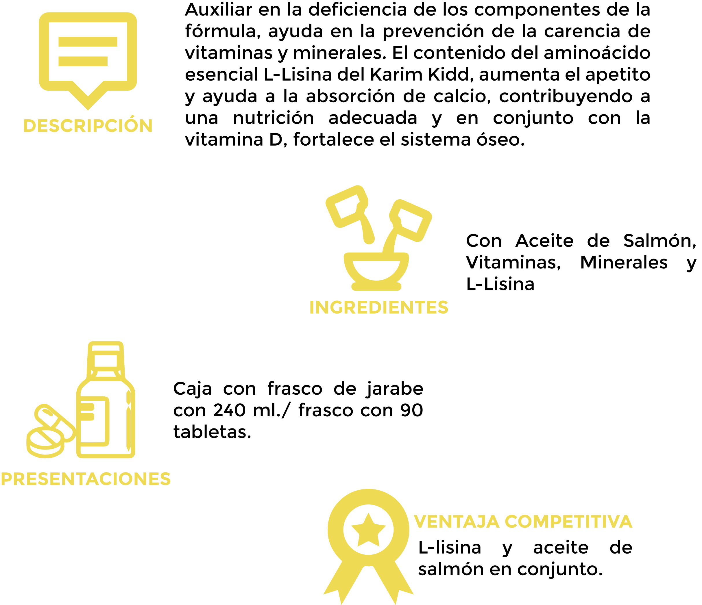 Auxiliar en la deficiencia de los componentes de la fórmula, que en conjunto con una buena alimentación, favorecen el crecimiento, desarrollo físico y mental de los niños y adolescentes, ayudando tambien en la prevención de la carencia de vitaminas y minerales. El contenido del aminoácido esencial L-Lisina del Karim Kidd, aumenta el apetito y ayuda a la absorción de calcio, contribuyendo a una adecuada nutricióny conjunto con la vitamina D, fortalece el sistema óseo.El Aceite de Salmón actúa en las funciones cerebrales, como la memoria y la visión.