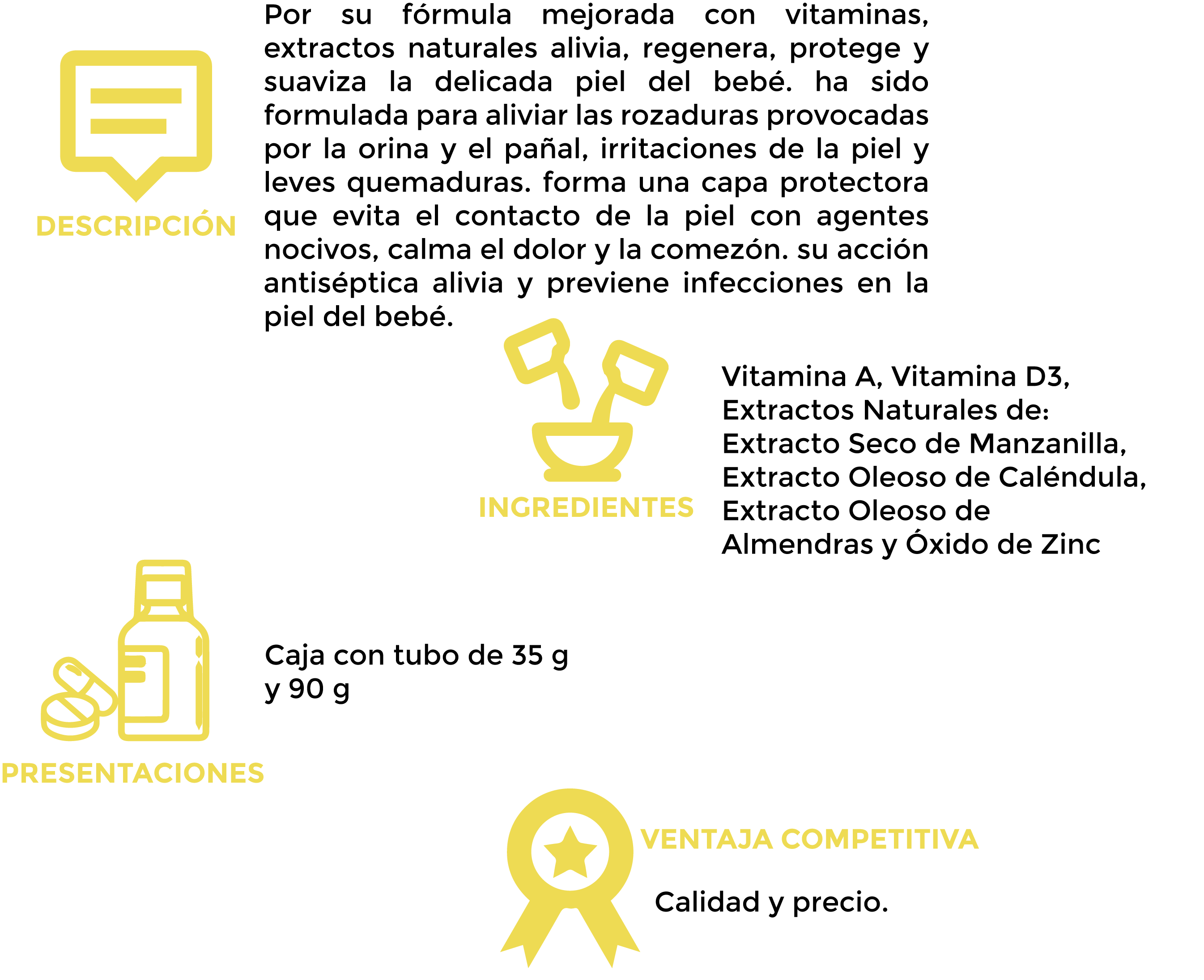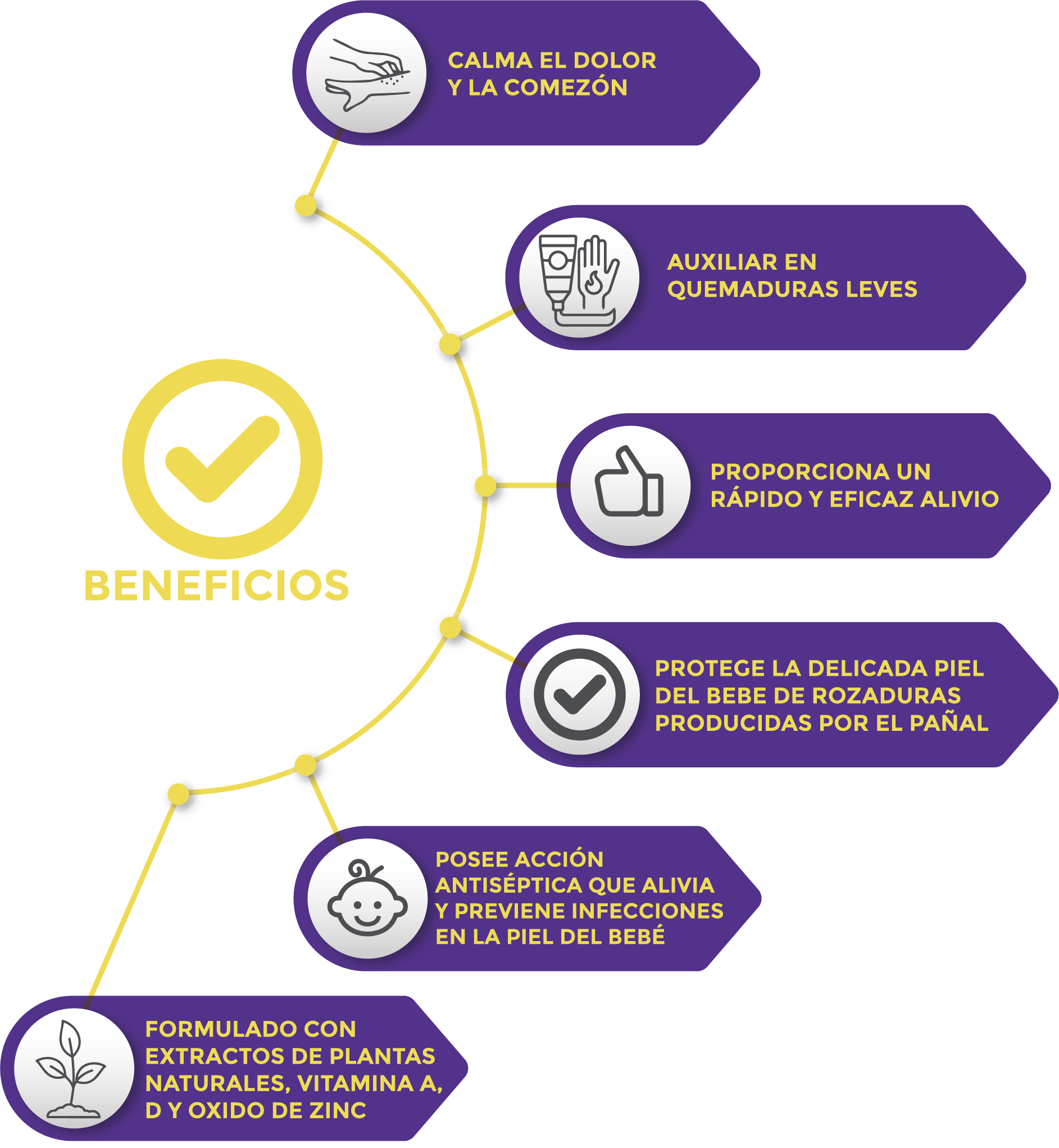 Por su fórmula mejorada con vitaminas y extractos naturales alivia, regenera, protege y suaviza la delicada piel del bebé. Ha sido formulada para aliviar las rozaduras provocadas por la orina y el pañal, irritaciones de la piel y leves quemaduras.Forma una capa protectora que evita el contacto de la piel con agentes nocivos, calma el dolor y la comezón.Su acción antiséptica alivia y previene infecciones en la piel del bebé.