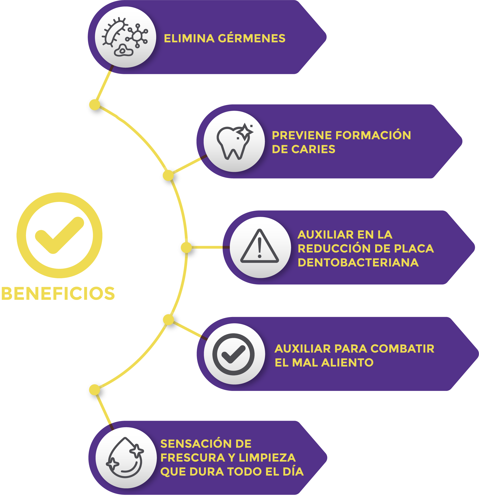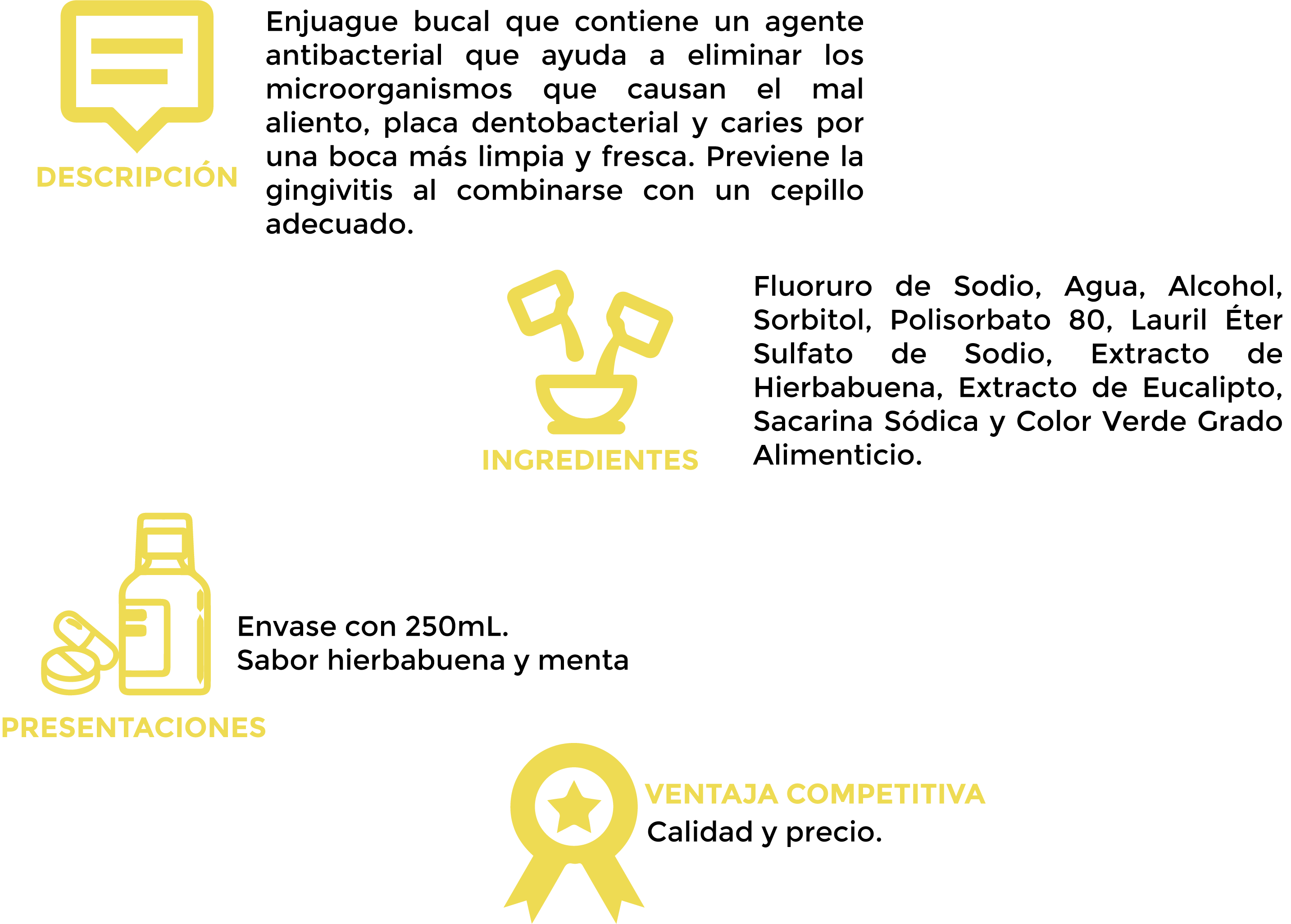Enjuague bucal que contiene un agente antibacterial que ayuda a eliminar los microorganismos que causan el mal aliento, placa dentobacterial y caries por una boca más limpia y fresca. Previene la gingivitis al combinarse con un cepillo adecuado.
