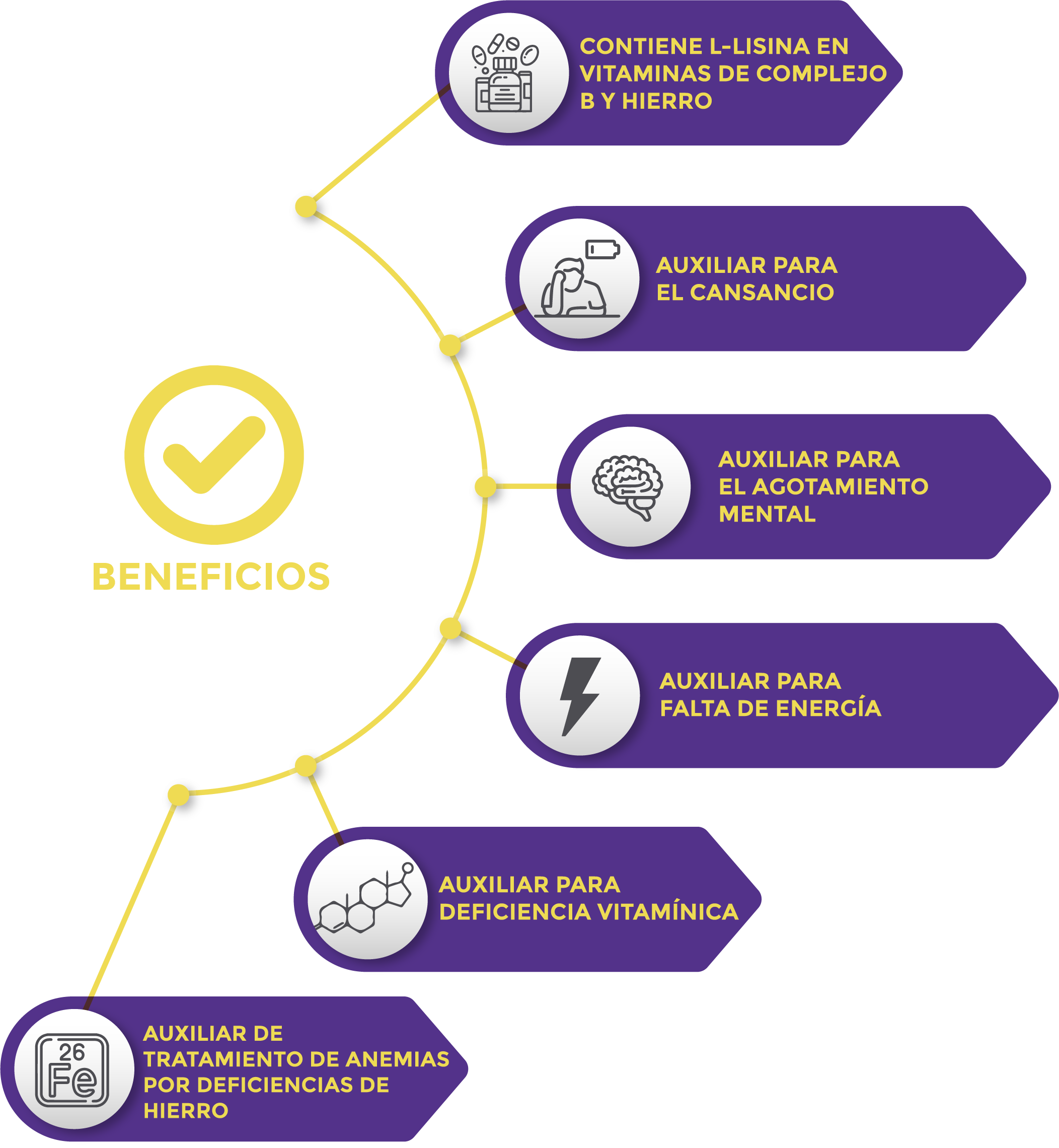 Es una fórmula equilibrada con vitaminas, minerales esenciales y aminoácidos que cubren las necesidades nutricionales específicas del organismo, esta indicado en la deficiencia de cualquiera de los componentes de la fórmula y es auxiliar en el tratamiento de anemias por deficiencia de hierro por una inadecuada nutrición.