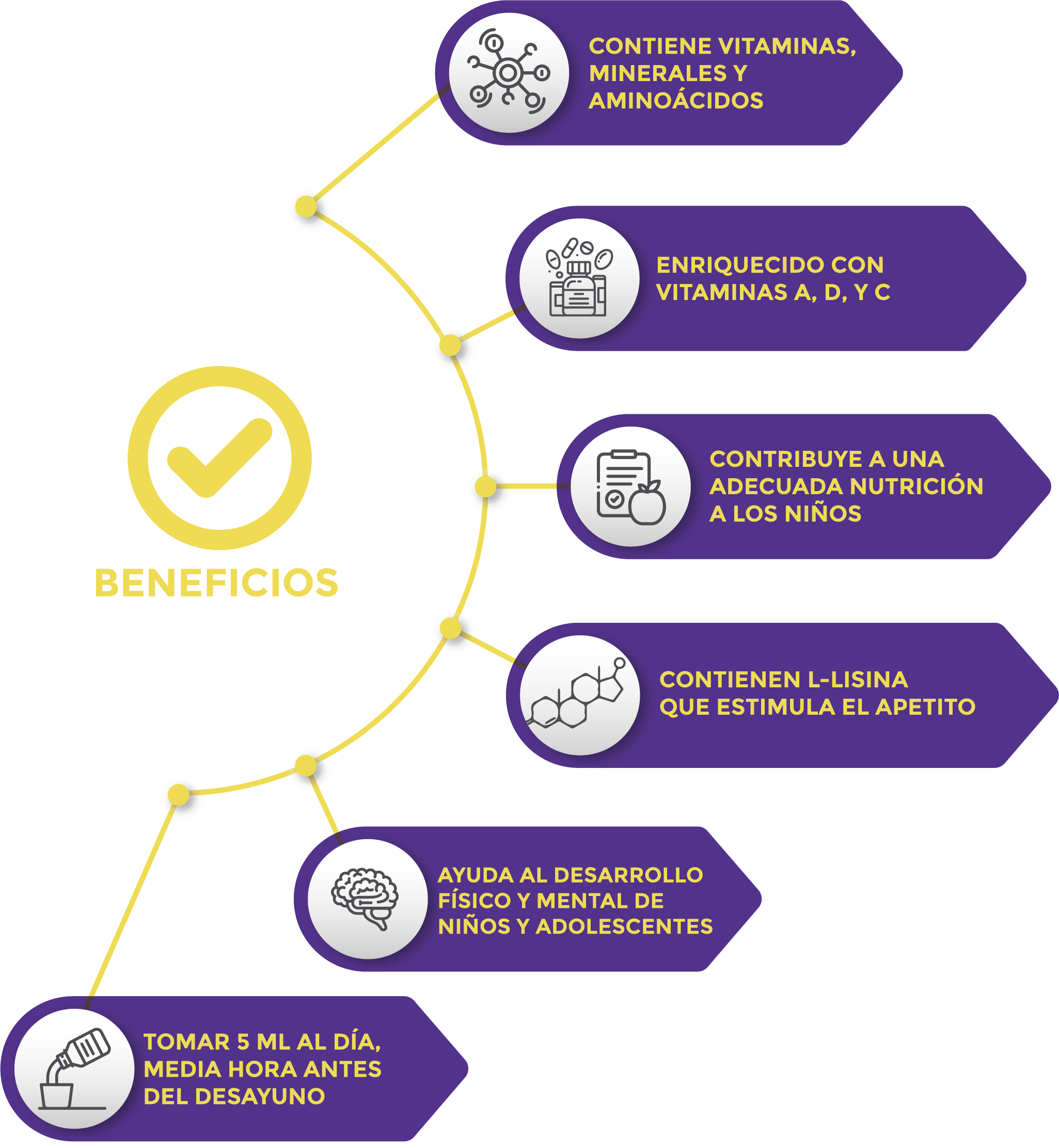 Auxiliar en la deficiencia de los componentes de la fórmula, que en conjunto con una buena alimentación, favorecen el crecimiento, desarrollo físico y mental de los niños y adolescentes, ayudando tambien en la prevención de la carencia de vitaminas y minerales. El contenido del aminoácido esencial L-Lisina del Karim Kidd, aumenta el apetito y ayuda a la absorción de calcio, contribuyendo a una adecuada nutricióny conjunto con la vitamina D, fortalece el sistema óseo.El Aceite de Salmón actúa en las funciones cerebrales, como la memoria y la visión.
