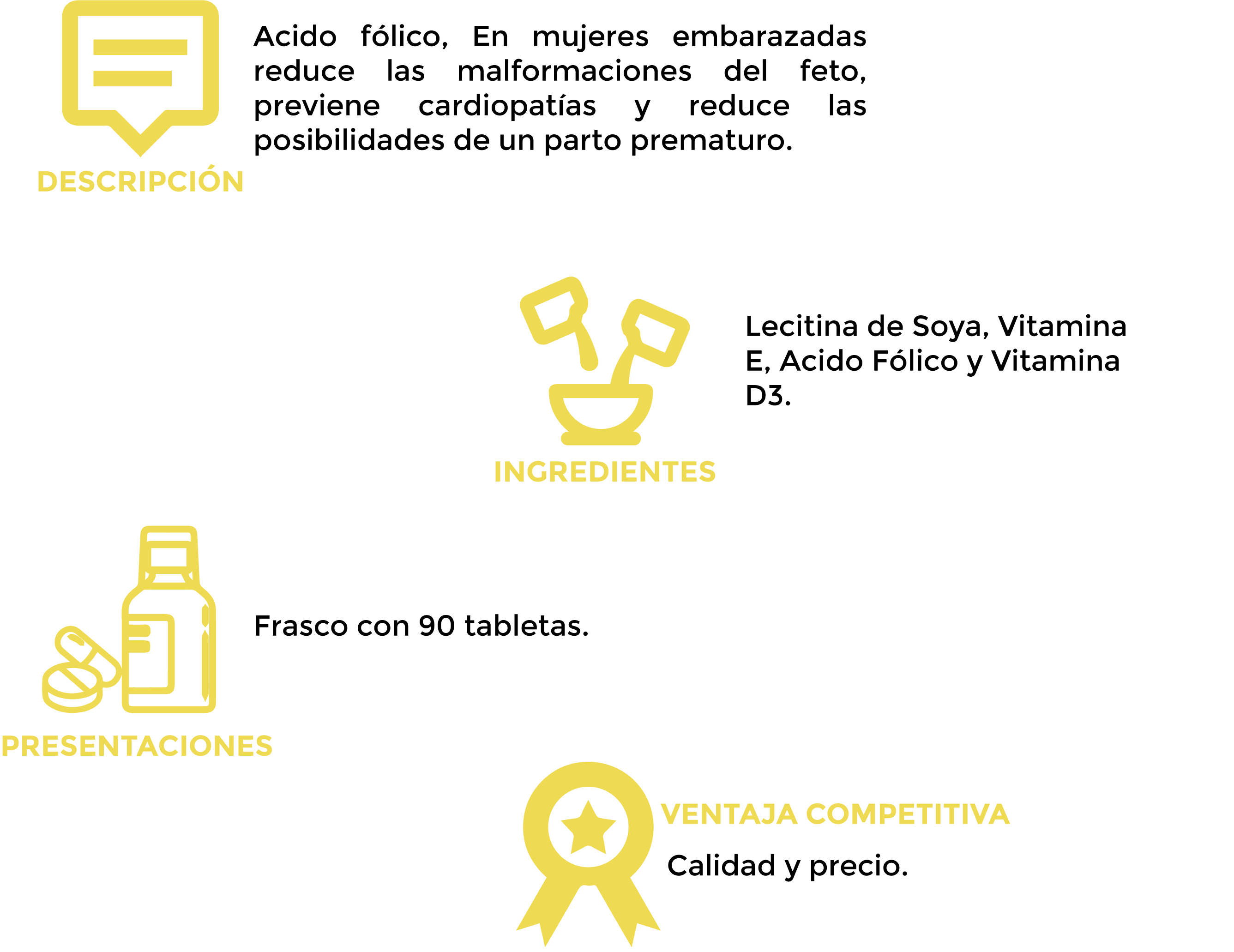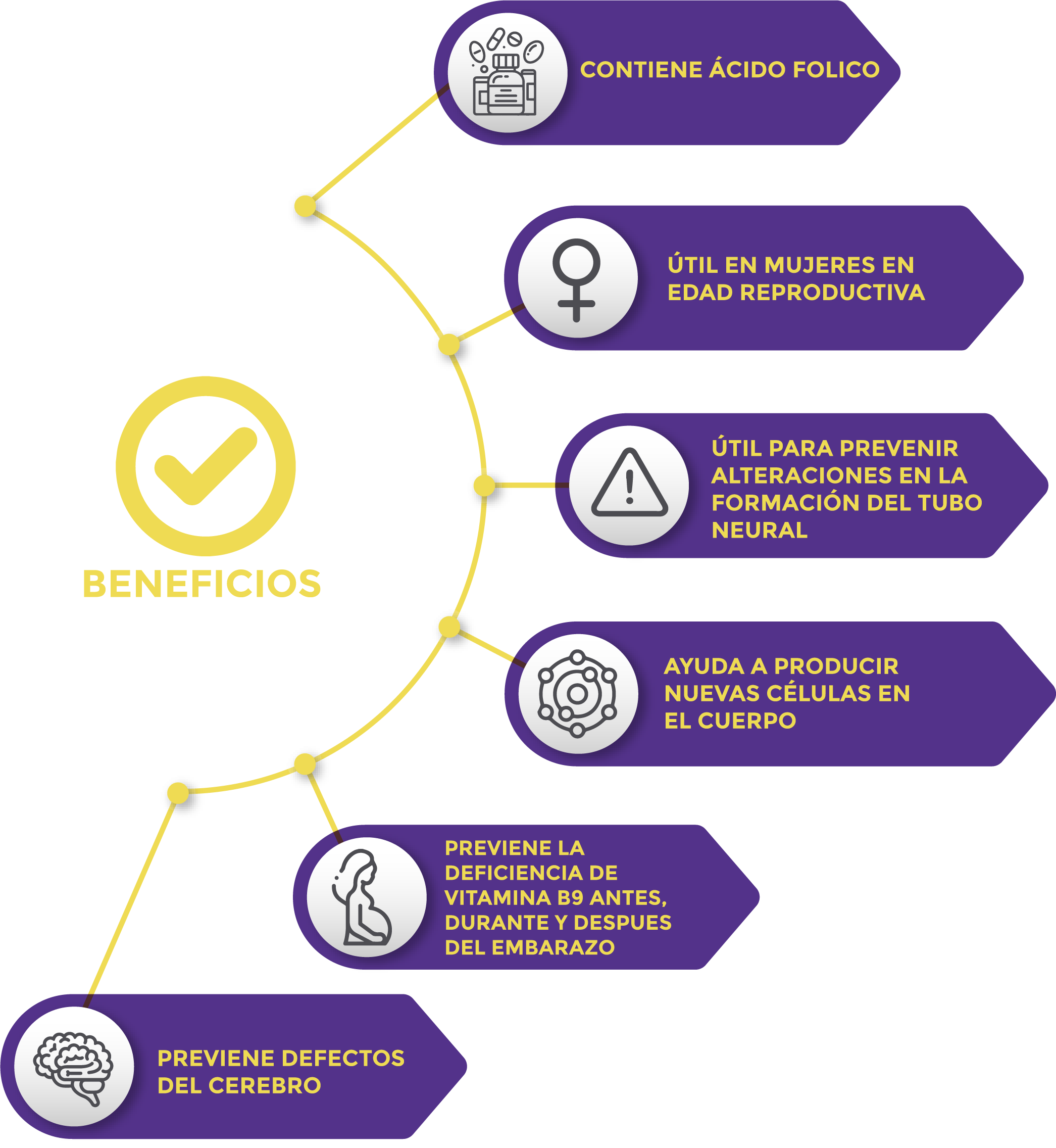 Ácido fólico, vitamina esencial para la salud. Contribuye al crecimiento de los tejidos y de las células. Contribuye a la formación de glóbulos rojos, por lo que es un elemento fundamental para prevenir anemias. En mujeres embarazadas reduce las malformaciones del feto, previene cardiopatías y reduce las posibilidades de un parto prematuro.